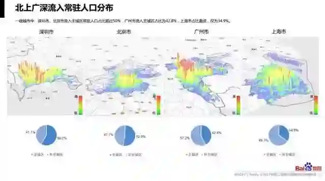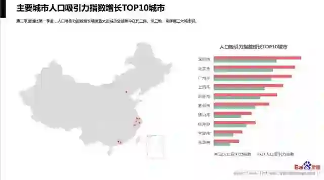 基于百度地图开放平台海量位置数据,第二季度全国60个主要城市人口吸引力榜单综合排名中,深圳市排名第一,北京、广州、上海、东莞分列2-5位。60个主要城市吸引了全国城市新流入常驻人口的53%,较第一季度上涨9%,人口向主要城市聚集现象更加显著。地域分布上,前20名仅有4个北方城市上榜,南方城市整体吸引力占优,但北上广深优势更加明显。