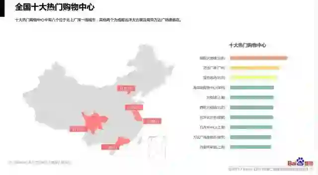 在2017年第二季度,全国十大热门购物中心中有8个位于北上广深一线城市,其他两个位于成都和南京,分别为北京朝阳大悦城、广州正佳广场、北京蓝色港湾、深圳海岸城、上海大悦城、北京西单大悦城、成都远洋太古里、上海日月光中心、南京万达广场建邺店、上海月星环球港。