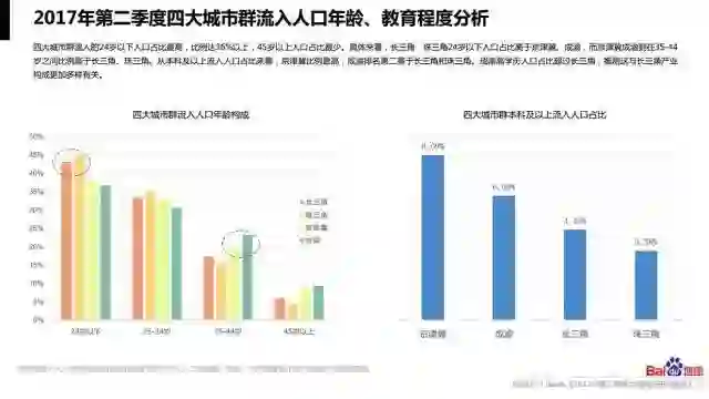 从流动人口来源和去向的综合分析上,四川、河南、安徽、湖南、山东这5个人口大省中,大家选择的目标城市也具有鲜明的地域特征,比如四川有61.07%的人口流向成渝、湖南68.66%的人口流向珠三角、安徽85.65%的人口流向长三角,虽然出门在外但仍希望离家近一点,成了中国人不约而同的选择。另外从年龄和教育程度的角度看,京津冀流入人口中年人更多但学历也更高,珠三角更年轻但平均学历也相对更低,地区产业结构与外来人才结构之间存在直接联系。