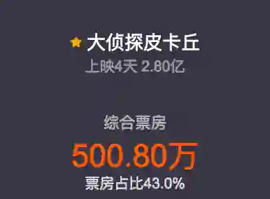 而海外市场上,《皮卡丘》北美5月9日提前场票房达到580万美元,此前5月3日《皮卡丘》已经在日本上映,累积票房约1000万美元,截至写稿时间,随着各大电影市场逐步开放,《皮卡丘》全球票房累积达到2070万美元。5月10日《皮卡丘》在北美4202家影院开画,Box Office Mojo预测《皮卡丘》北美首周末票房将达到6000万美元,最高可能达到7000万美元。