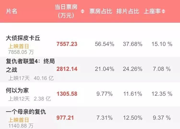 专资办“全国电影票房”APP显示,《皮卡丘》国内首日开画票房达到7834.39万(包括午夜场票房),电影排片占比达到37.71%,综合票房占比为56.58%,《复联4》排片从昨日47.02%下滑至24.27%,单日票房2803万。