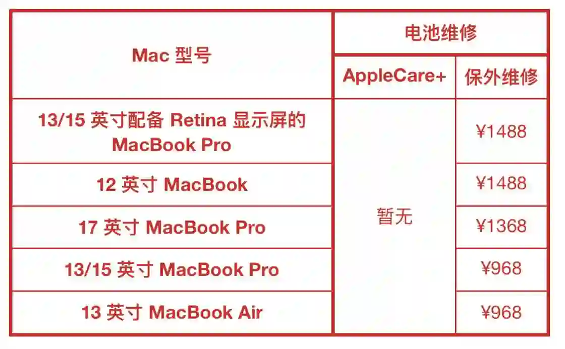下表列示了截止 2017 年 10 月 1 日 Apple 官网在售 Mac 的维修费用。