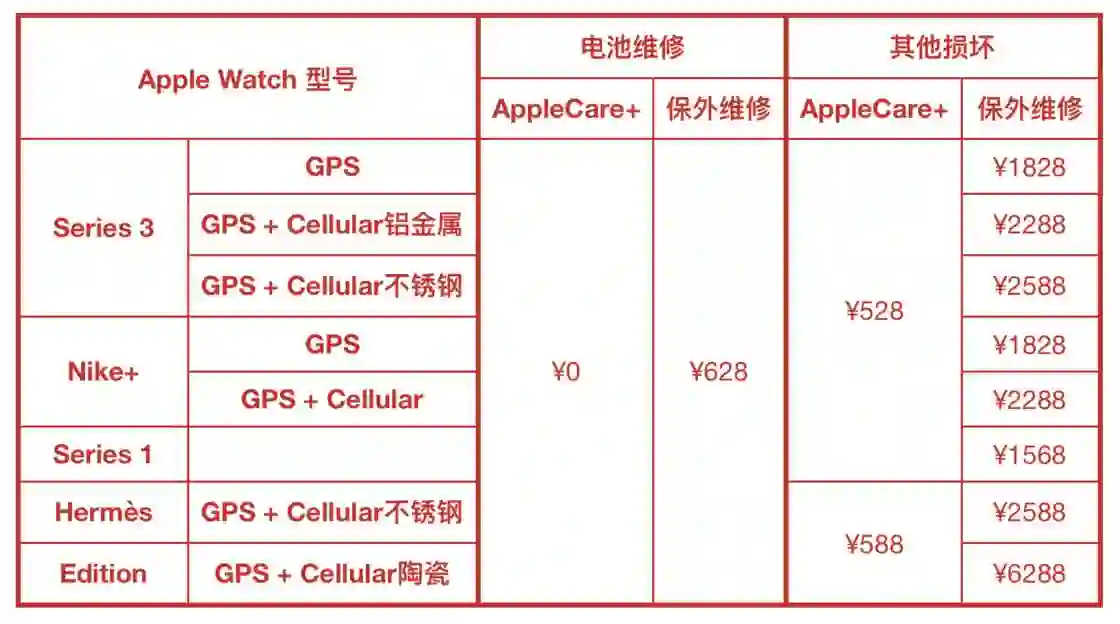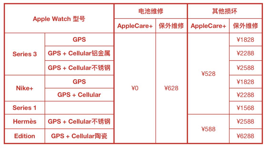 下表列示了截止 2017 年 10 月 1 日 Apple 官网在售 Apple Watch 的维修费用。