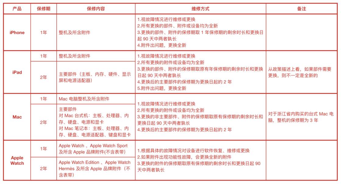 虽然我们常会在互联网或者微博等社交媒体看到 Apple 产品出现质量问题的消息,但从整个庞大的用户群体中来看,保内维修的发生概率非常低。中国消费者权益相关法律法规等政策 也对 Apple 产品的保内维修政策提出较高的要求,例如在美国地区 Mac 电脑不论整机还是主要部件,其保修期只有 1 年,而在整个中国大陆还有浙江省都有额外的要求。