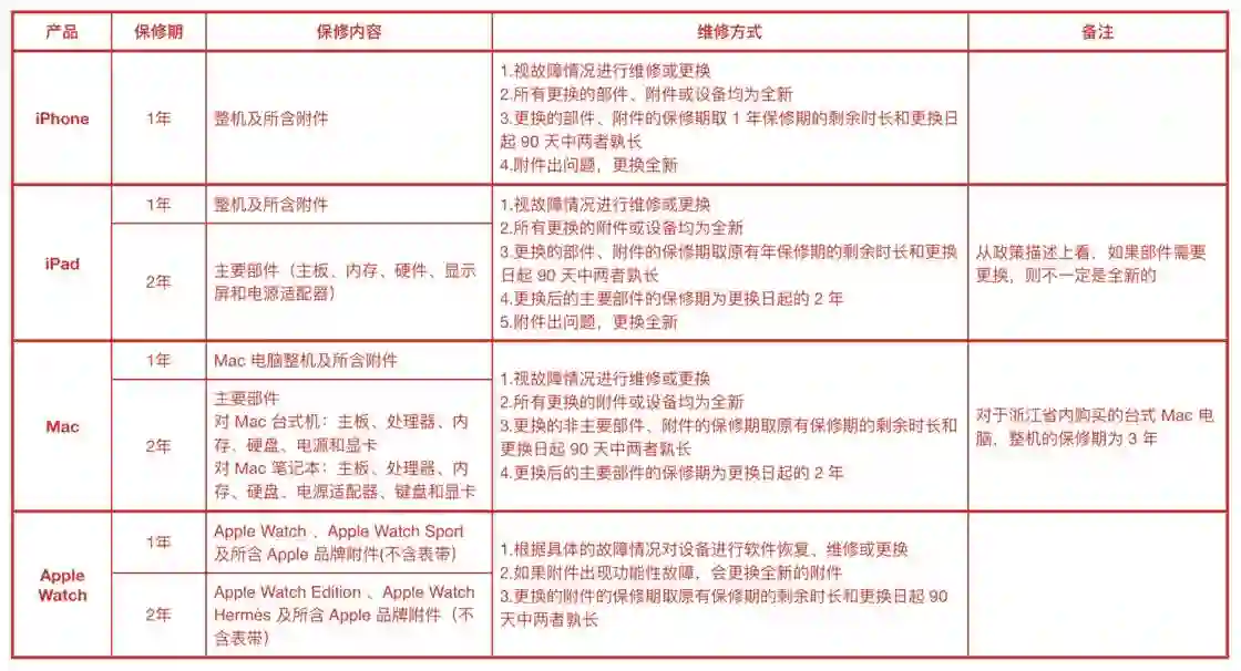 从保修政策中可以看出,对于 iPhone、iPad、Mac 及普通的 Apple Watch,整机保修时间均只有 1 年,部分产品的主要部件保修期为 2 年,而在浙江省购买的台式 Mac 电脑是个特例(梅雨季节时设备内部潮湿),它的整机保修期为 3 年。