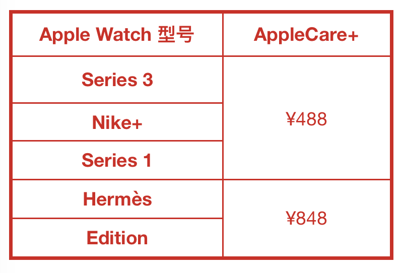 下表列示了目前 Apple 官网在售 Apple Watch 及其适用的 AC+ 价格,因 Apple Watch 表盘而有些许不同。对 Series 3/1 和 Nike+ 等,AC+ 费用为 ¥488,它将 1 年保修期延长至 2 年,并提供 2 次意外损坏保修服务;对于 Hermès 和 Edition,AC+ 费用为 ¥848,它将 2 年保修期延长至 3 年。90 日的免费电话技术支持也有相应的延长。适用于 Apple Watch 的 AC+ 需要在购买 Apple Watch 后的 60 天内购买,且 Apple Watch 不得处于损坏状态。