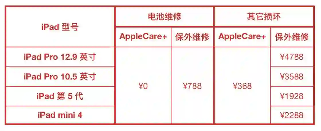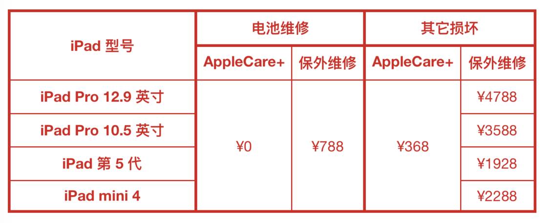 下表列示了截止 2017 年 10 月 1 日 Apple 官网在售 iPad 的维修费用。iPad 由于屏幕胶合等工艺和环保方面原因,没有单独的屏幕维修,也就是说屏幕维修与其它损坏维修费用一致。