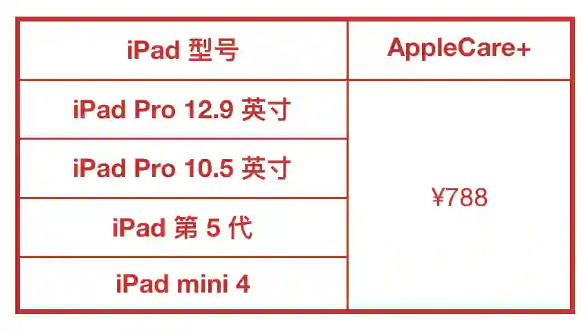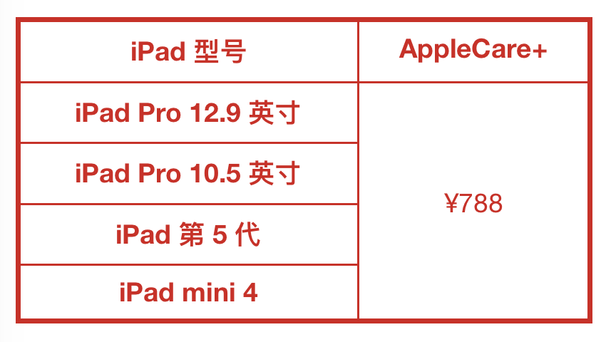 下表列示了目前 Apple 官网在售 iPad 及其适用的 AC+ 价格。iPad 的 AC+ 内容与 iPhone 的相同:它将 1 年整机保修期延长至 2 年,并提供两次意外损坏维修服务。下表列示了目前 Apple 官网在售 iPad 及其适用的 AC+ 价格,均为 ¥788。90 日的免费电话技术支持也有相应的延长。适用于 iPad 的 AC+ 需要在购买 iPad 后的 60 天内购买,且 iPad 不得处于损坏状态。