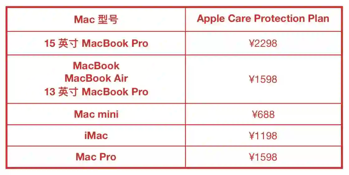 适用于 Mac 的 ACPP,因 Mac 型号也有不同。上文提到 ACPP 不同于 AC+,它没有意外损坏维修,例如咖啡倒在了 MacBook 键盘上等的维修等人为或意外情况,没有优惠的维修费用。ACPP 的具体内容包含将整机保修期和电话技术支持延长至 3 年、软件使用问题咨询和全球联保功能等。