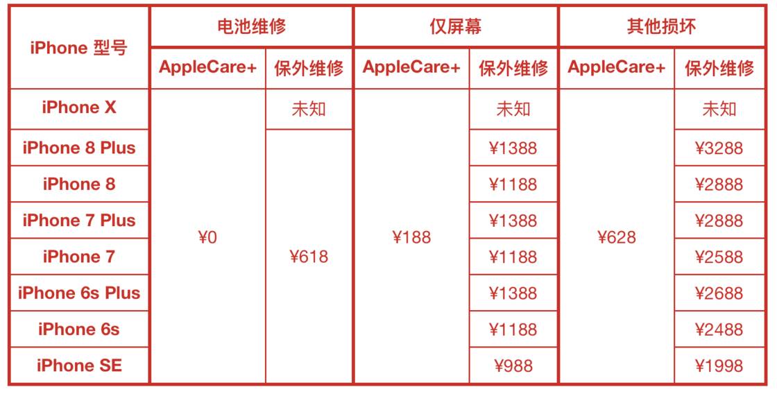 下表列示了截止 2017 年 10 月 1 日 Apple 官网在售 iPhone 的维修费用。适用于 iPhone 的 AC+ 保修具体内容,少数派先前的文章 已经做了详细的介绍,有兴趣的读者可以前往阅读。