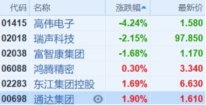 早盘苹果概念股还一度因苹果业绩超预期盘后股价大涨被带动,纷纷高开,但今天最终还是没能改变颓势,高开低走最终多数收跌。如下图: