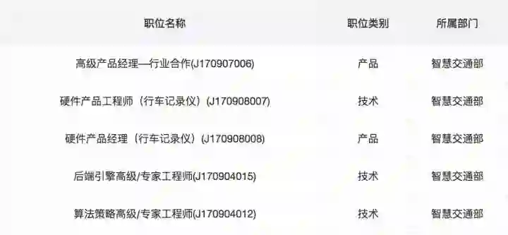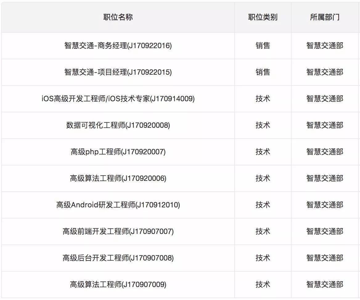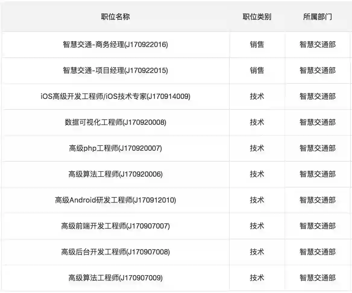 欢迎优先加入我们智慧交通部,滴滴智慧交通致力于成为全球最大的智慧交通综合服务提供商,打造未来智慧交通样板城市。已经陆续推出了智慧信号灯、交通信息平台、重点城市交通运行报告、智慧诱导屏、车载设备等产品,在国内交通领域一定的影响力。我们部门的职位如下: