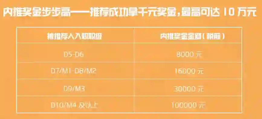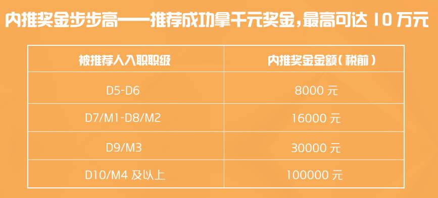 作为一家对技术产品有着高要求的公司,我们的内推奖金也是逐年升高,目前最新的内推奖金是 8000-100,000