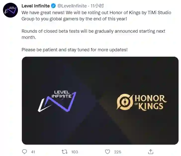 腾讯海外发行品牌Level Infinite宣布,将在年底前向全球玩家推出《王者荣耀》国际版,下月开始将逐步公布多轮内测。(品玩)