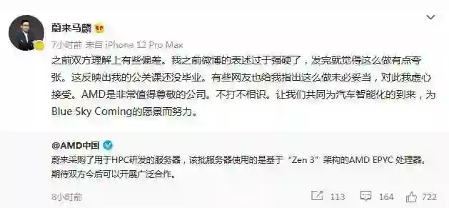 针对蔚来高管否认与AMD合作,AMD中国微博8日晚发文称,蔚来采购了用于HPC研发的服务器。蔚来企业传播高级总监马麟再度转发称,“之前双方理解上有些偏差。我之前微博的表述过于强硬了。”(中新经纬)