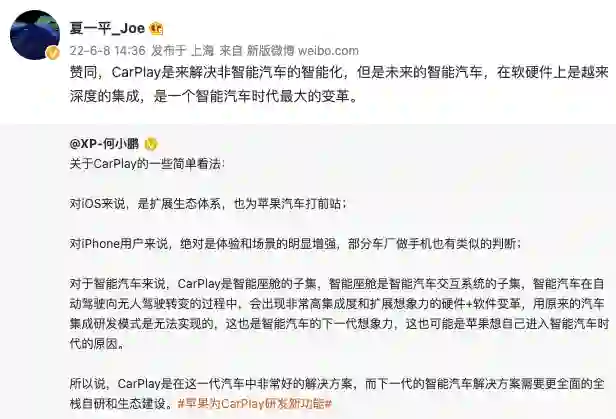 小鹏汽车创始人何小鹏表示,智能汽车在自动驾驶向无人驾驶转变的过程中,会出现非常高集成度和扩展想象力的硬件+软件变革,苹果车载交互系统CarPlay是在这一代汽车中非常好的解决方案,而下一代解决方案,需要更全面的全栈自研和生态建设。集度汽车CEO夏一平转发该微博并表示赞同。(新浪科技)