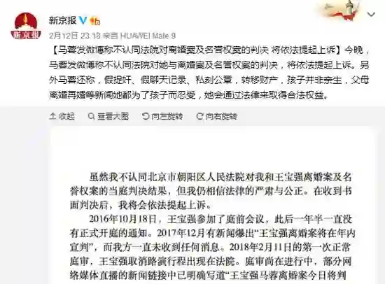 3、12日,马蓉发微博称不认同法院对她与离婚案及名誉权案的判决,将依法提起上诉。另外马蓉还称,假捉奸、假聊天记录、私刻公章,转移财产,孩子并非亲生,父母离婚再婚等新闻她都为了孩子而忍受,她会通过法律来取得合法权益。