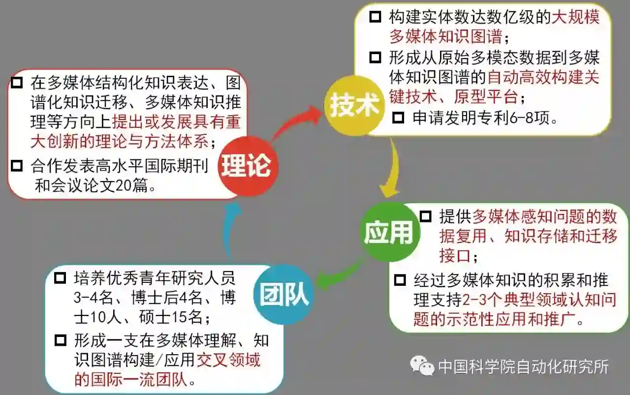 一是跨媒体知识图谱构建,研究跨媒体实体和关系表达学习、跨媒体知识关联和图谱构建。二是图谱化跨媒体推理应用,基于知识图谱的跨媒体知识迁移和复用、基于知识图谱的跨媒体推理,实现基于知识图谱的跨媒体推理和智能演化,解决跨媒体认知复杂问题。