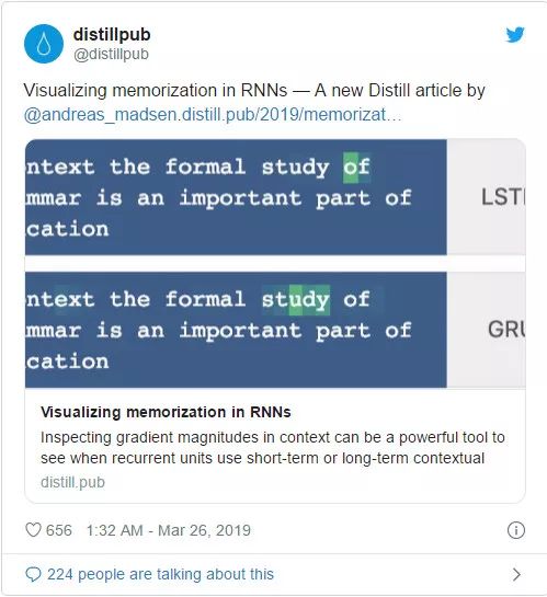 2018 年 3 月,我在「distill.pub」平台上作为唯一作者发表了论文「Visualizing memorization in RNNs」,说明了针对自然语言处理任务,如何通过一种交互式的显著性可视化技术,证明两个准确率几乎一样的模型具有差异极大的表现。