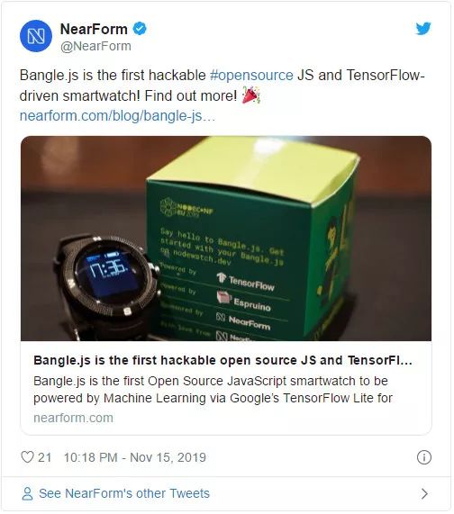2019 年,他们也曾邀请我为其在 NodeConf EU 2019 上推出的物联网智能手表/胸牌开发 TensorFlow 组件。虽然这笔收入不足以支撑我全年的所有开支,但也对我帮助很大。