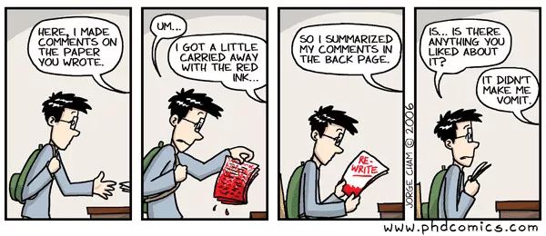 虽然 Alexander 本人并没有获得博士学位,但他具有非常棒的批判性思维。我并不认为必须和那些有很多一作论文、或者有多年论文指导经验的人交流。重要的是,我们需要和那些能针对我们的研究工作提出问题的人交流。不然的话,我们可能会变得懒惰,对自己论文中存在的错误视而不见。请尽量与别人讨论你的论文,这会给你增加很大的压力,让你不会寄希望于投机取巧。