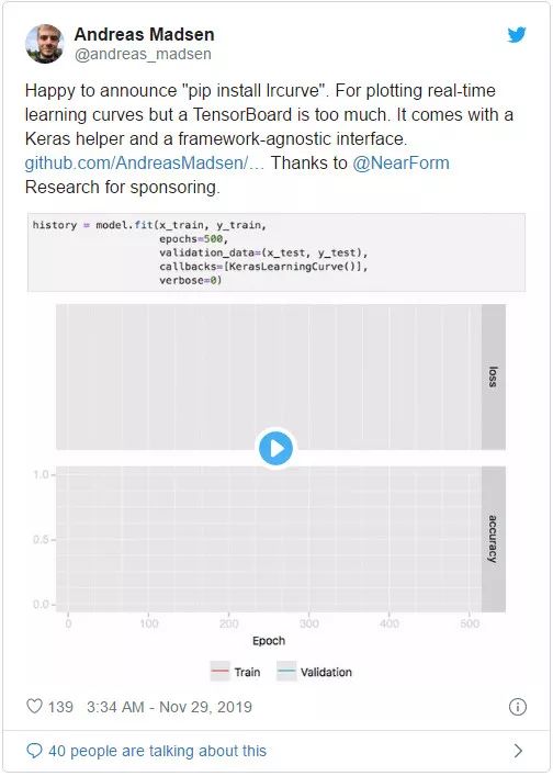 图 5:三天完成的附带项目示例,用到这个项目的研究者会十分感谢你,从中你可以感受到鼓励。(推特大意:很高兴在此发布「pip install Ircurve」。它可以被用于绘制实时的学习曲线,而不像 TensorBoard 那样繁琐。它包含一个 Keras 帮助文件和模型无关的接口。