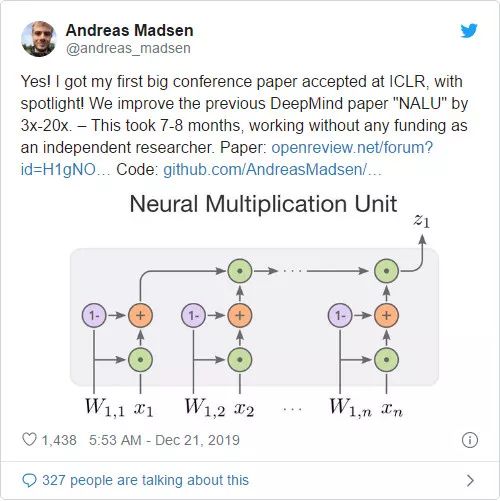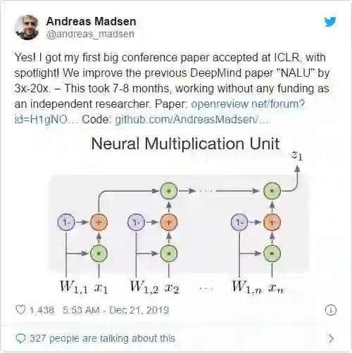 图 1:是的!我的第一篇顶会论文本 ICLR 接收为 spotlight 了!我们将 DeepMind 的论文「NALU」中的性能提升了 3-20 倍。我在没有任何资助的情况下,作为独立研究者,花了 7-8 个月完成了这份工作。