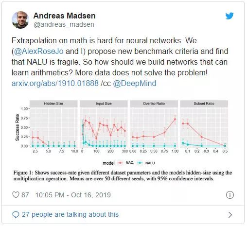 我们还将这项工作写在了推特上,并发布了 NALU 一作的标签,他回复道:「很棒的工作!有了好的对比基准,我们才能继续改进模型」。这对我们来说很有帮助,我们不必再为实验设置和我们的新模型而争论了。相反,我们可以专注于我们提出的模型。