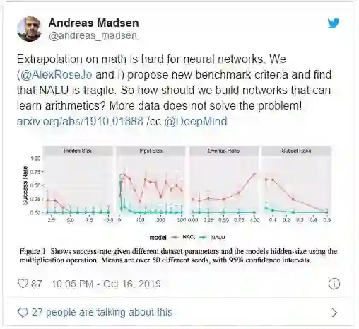 而且,NALU 这篇论文只展示了具有单个种子(seed)的结果,而我们的论文展示的是具有 100 个种子时的结果。关于个话题我们发表了一篇 workshop 论文「Measuring Arithmetic Extrapolation Performance」(论文地址:https://arxiv.org/abs/1910.01888)。