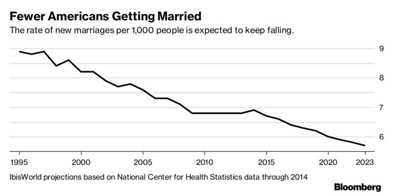 美国的结婚率,每千人中新婚人士所占的比例,已经连续数年下滑。在2008年和2009年的经济大萧条时期,结婚率的下滑尤为明显,但是即便经济恢复过来,也没有证据显示人们重拾了对婚姻的兴趣。研究机构IbisWorld预计,在未来五年内,结婚率将会持续下降。