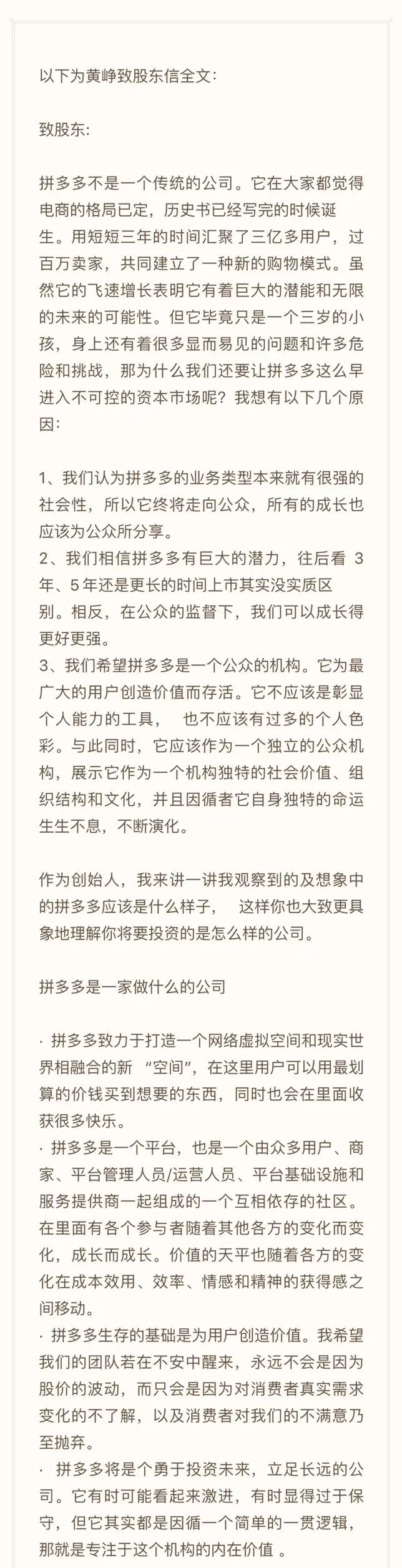 黄峥发布了一封致股东公开信,在解释为何提前上市时,黄峥表示,“虽然拼多多是一个三岁的小孩,身上有很多显而易见的问题,也面临许多危险和挑战。但拼多多的业务有很强的社会性,所以它终将走向公众,所有的成长也应该为公众所分享。”