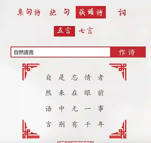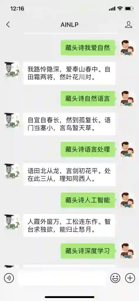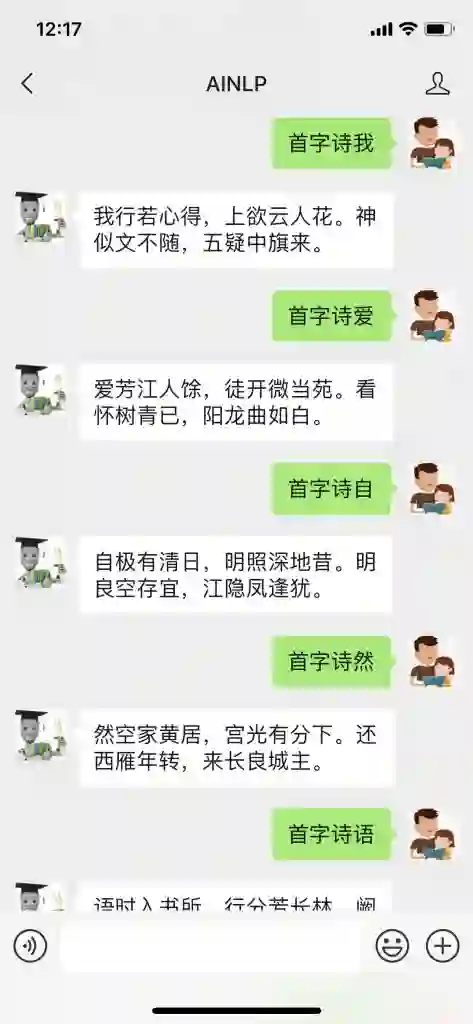请注意这两个功能目前只提供'五言绝句'的生成,因为上述代码在训练模型的时候已经过滤了其他诗词,另外这套代码也用了一些trick,生成的结果也是随机的,每次都不一样。最后,感兴趣的同学欢迎关注AINLP公众号,直接在公众号对话里测试即可: