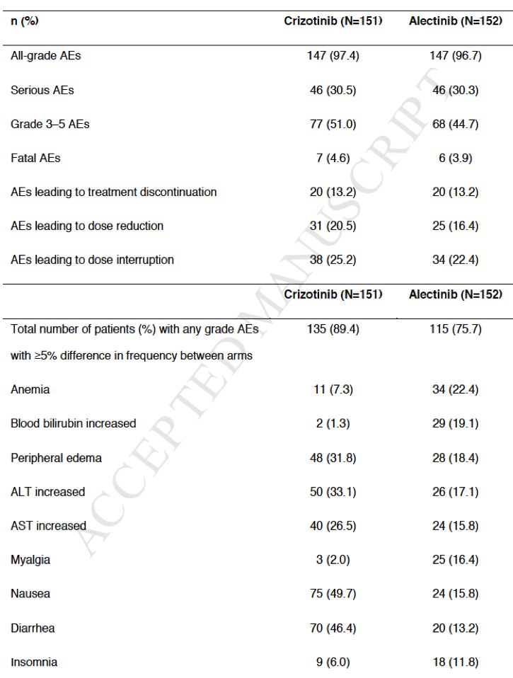 两组AE发生率相差≥5%的患者中,大多数AE克唑替尼组较阿来替尼组更高,见表2。两组发生率均超过≥10%的AE,最常见的为便秘,阿来替尼组和克唑替尼组分别为35.5%和33.8%。最常见的与研究药物相关的,任意一组发生率≥30%的AE,包括恶心(7.9 vs 43.0%)、ALT升高(14.5% vs 30.5%)和腹泻(6% vs 38%)。
