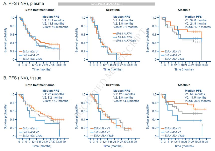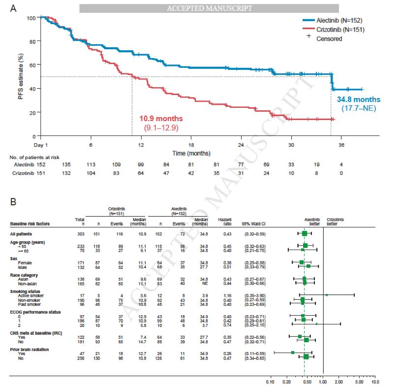 本研究报道ALEX研究延长随访10个月后(截止日期:2017年12月1日)更新的数据,并探索性分析EML4-ALK变体亚型对阿来替尼和克唑替尼疗效的影响。