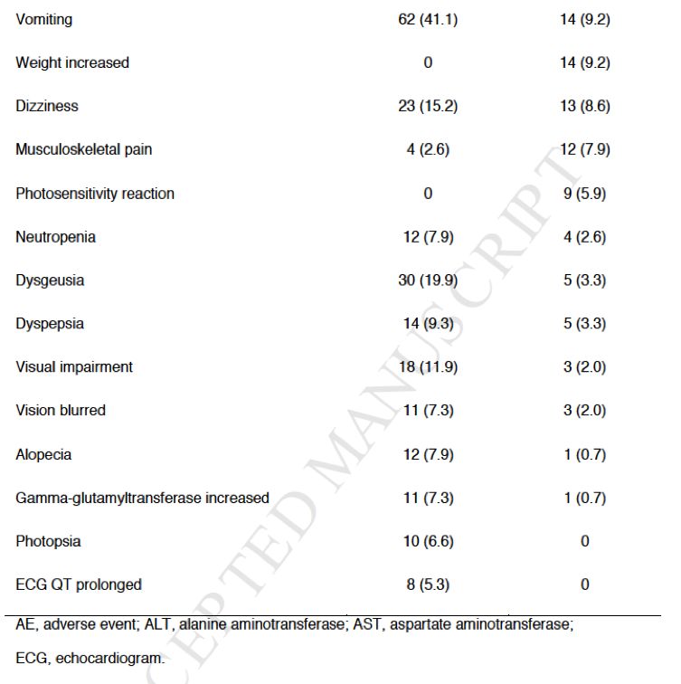 303例患者中,222例(73%)纳入血浆BEP人群,阿来替尼组和克唑替尼组分别为107和115例;203例(67%)例纳入组织BEP人群,阿来替尼组和克唑替尼组分别为107和96例。在77例血浆标本和67例组织标本中,未检测到ALK融合变体。在血浆和组织标本中均检测到非EML4-ALK融合变体,其中血浆10例(阿来替尼组和克唑替尼组分别为3例和7例);组织标本12例(两组分别为7例和5例);此外,分别检测到8例和12例非EML4-ALK V1,2,3a/b变体。