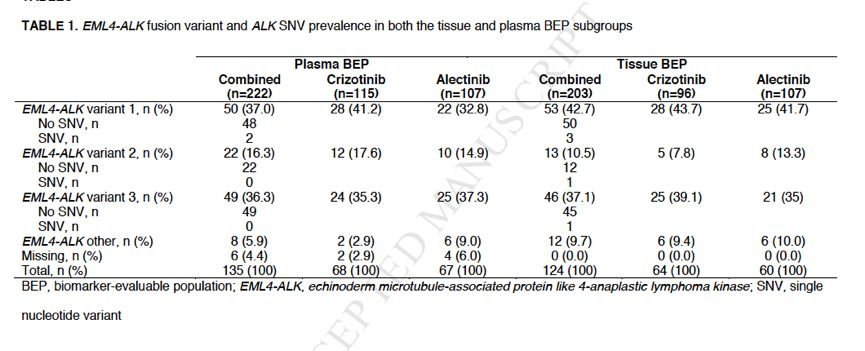 表1 组织学和血浆BEP人群中,EML4-ALK融合变体和ALK SNV发生率