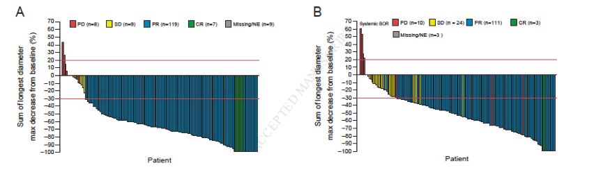ORR与既往报道的结果相似,阿来替尼组和克唑替尼组分别为82.9% vs 75.5%。总体而言,两组分别有78.3%和73.5%的患者取得疾病部分缓解(PR),见图2。中位DOR分别为33.1 vs 11.1个月。在基线合并CNS转移的患者中,阿来替尼组和克唑替尼组分别有76.6%和65.5%的患者取得PR;在基线未合并CNS转移的患者中,两组分别有79.5%和78.5%的患者取得PR。在治疗取得缓解的患者中,阿来替尼组的肿瘤缓解深度更为显著,肿瘤缩小>75%、50%和25%的患者分别占36.2%、75.0%和82.9%;而克唑替尼组中,相应的患者比例分别为19.9%、50.3%和82.8%。