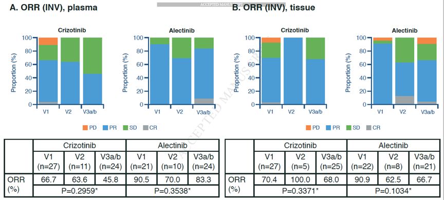 在组织或血浆样本中,不同EML4-ALK融合变体人群,研究者评估的ORR均无显著差异,无论是阿来替尼或克唑替尼组,见图4A和4B。在常见ALK融合患者中,研究者评估的ORR,阿来替尼组高于克唑替尼组。采用组织标本检测,EML4-ALK融合变体1的患者,阿来替尼组的ORR高于克唑替尼组,变体 3a/b的患者,两组的ORR相似,而变体2的患者,阿来替尼组较克唑替尼组低(62.5% vs 100%,见图4B),然而变体2的患者人数非常少,很难得到有意义的结论(两组分别为8例和5例)。