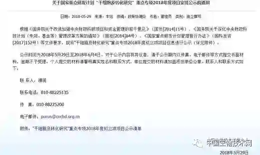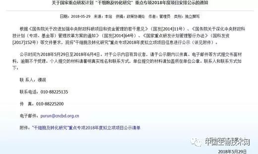 中国生物技术发展中心网站显示,根据《国务院关于改进加强中央财政科研项目和资金管理的若干意见》(国发[2014]11号)、《国务院关于深化中央财政科技计划(专项、基金等)管理改革方案的通知》(国发[2014]64号)、《国家重点研发计划管理暂行办法》(国科发资[2017]152号)等文件要求,现将“干细胞及转化研究”重点专项2018年度拟立项项目信息进行公示。公示时间为2018年5月29日至2018年6月4日。