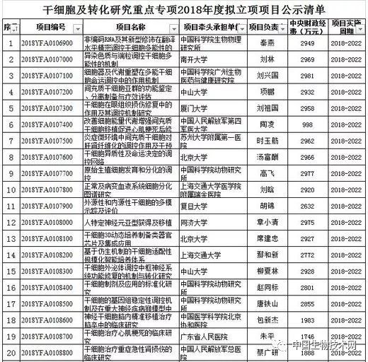 通知随附的《“干细胞及转化研究”重点专项2018年度拟立项项目公示清单》显示,2018年度拟立项项目共计30项。其中,中科院系统拟立项项目最多,达6项。另外包括中山大学3项、北京大学2项、复旦大学2项等。拟立30项项目共计获得中央财政经费5.8544亿元,单个项目获得中央财政经费做多可达近3000万元。项目实施周期均为2018年-2022年。