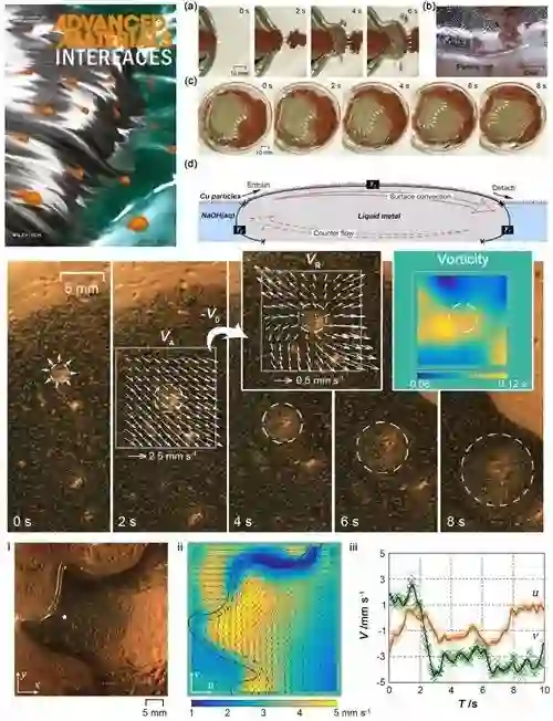 题为 Triggering and Tracing Electro-Hydrodynamic Liquid-Metal Surface Convection with a Particle Raft 的论文发表在 Advanced Materials Interfaces 上,研究小组在偶然的实验中发现一个基础现象,即撒落在液态金属表面的铜粉被润湿后能够持续诱发其发生大范围流动与变形(图2),彰显“小颗粒,大作用”。该效应被证实为一种表面张力梯度驱动的流动,表面张力的不均匀分布来自于有着不同表面电荷密度的金属颗粒与液态金属间的耦合作用。该现象表明,对于液态金属这一独特的流体物质而言,即便只与很小的金属颗粒接触,其自身状态也极易发生改变。黏附于液态金属表面且随其流动的金属颗粒在实验观测中清晰可视,研究人员为此创造性的将颗粒引入作为液态金属流动状态的天然示踪粒子,获得了对液态金属流场的可视化和定量化测定,从而揭示了其中的独特对流模式。此前,液态金属由于自身不透明,表面极为光滑,光反射率高,已有的实验技术难以获得其流场信息,甚至不能对液态金属内部是否存在流动做出判断,使相应问题的研究始终处于停滞状态。此项发现为此建立了重要的研究工具;利用微小颗粒驱动大尺度流体也为构筑液体表面泵和智能流体系统提供了自驱动方案。