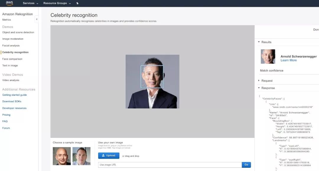 比赛期间,吴育昕团队成功地攻击了 AWS 名人鉴别系统,让它把蒋昌建识别为了施瓦辛格。
