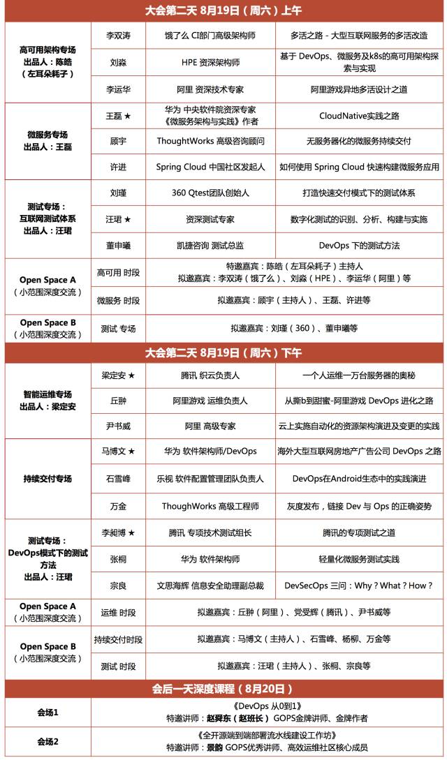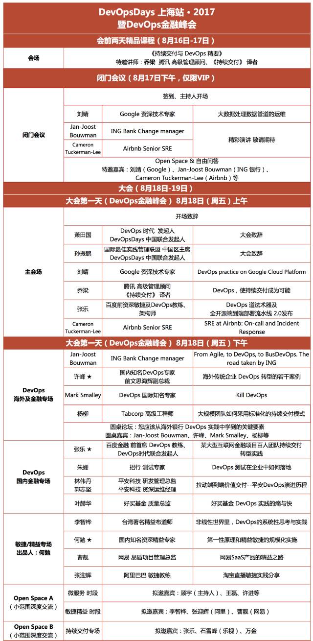 今年8月18日-19日,来自Google、Airnbnb、ING银行及各大互联网、金融公司大咖云集上海。议题覆盖:精益、敏捷、开发、运维、测试等DevOps全领域。