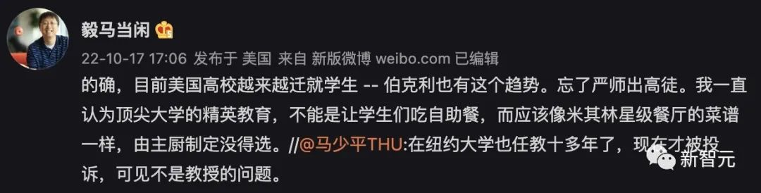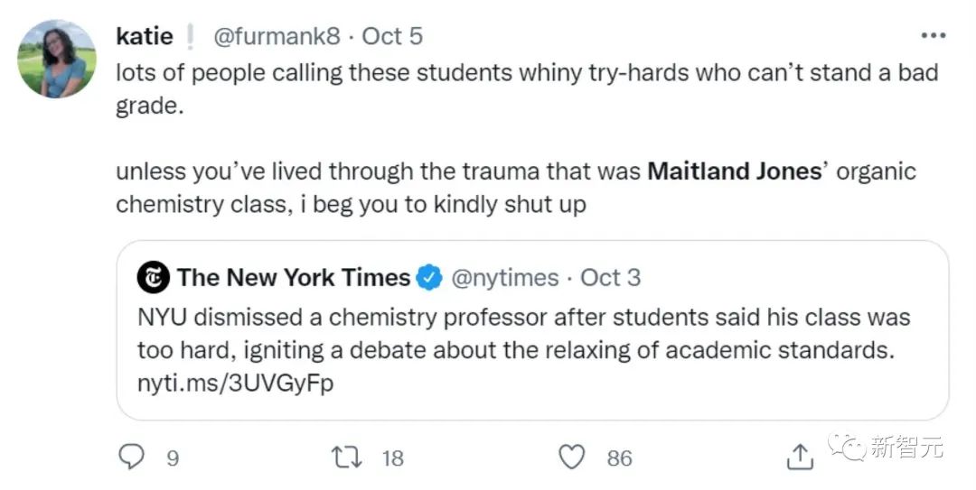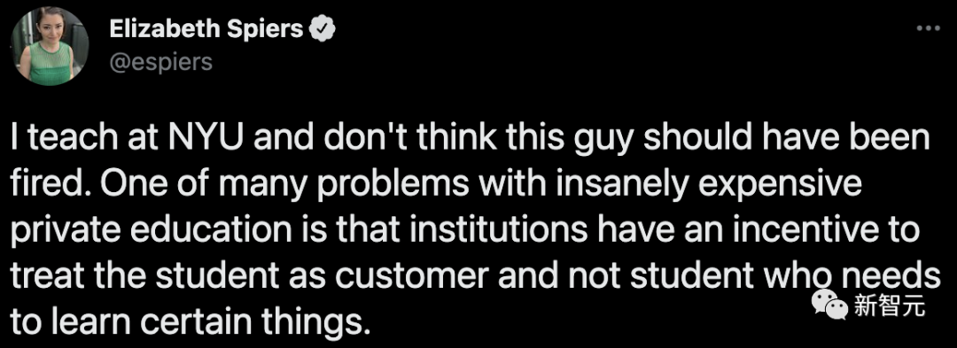 不过,教授和学生们的嘴仗还在打得热闹之时,纽约大学方面显然已经做出了自己的选择——支持学生,解雇Jones教授。校方和学院方面给出的理由是,Jones的表现「没有达到我们对教学人员的要求标准」。学院发言人在回应此事时还表示,Jones的教学「不负责任、反应迟钝、居高临下、评分也不够透明」。为了安抚学生,校方决定重新评定他们的成绩,并允许他们「追溯性退课」。纽约大学化学系主任Mark E. Tuckerman说,这是「学院给予学生的一次性例外」。该校化学系本科生研究主任Marc A. Walters说,这是学校「向学生和支付学费的人表示支持」,后者应该是指学生家长。这个处理方式在反对和支持学生投诉的人之中都引发了热烈讨论。与Jones博士密切合作的化学教授Paramjit Arora说:「校方显然是希望学生们高兴,为大学说好话,这样就会有更多人申请入学,US News的大学排名就会不断上升。」对此,纽约大学法学院教授Elizabeth Spiers也认为,现在私立教育面临的一个重要问题就是:「机构会更倾向于把学生当作顾客,而不是需要学习的学生」。担任过该课程助教、现在哈佛大学读博的Zacharia Benslimane也在给校方的电邮中为Jones辩护:「我认为这份请愿书更多的是出于对考试成绩不满意,而不是因为受到了不公平对待。而且我发现很多不断抱怨的学生,并没有使用我们提供给他们的教学资源。」在社交媒体上,也有不少支持的声音。「我总是提醒学生,如果因为一门课很难就想放弃的话,你是没有资格进入一个每天都很难的行业。」洛杉矶时报也撰文表示:大学生听好了,你的学费不是「得」来的,而是需要「挣」来的。UC伯克利的马毅教授也认为:「顶尖大学的精英教育,不能是让学生们吃自助餐,而应该像米其林星级餐厅的菜谱一样,由主厨制定没得选。」该课程的另一位助教表示,在Jones教授刚走上讲台的年代,教学标准是非常高、要求是很严格的。他的这种严格的教学风格和方法,在很多年里都没有改变。不过,现在的学生们已经变了。 这位助教还是希望学生们能认识到,让他们经历这种严格的考验,对今后的发展是有好处的。看起来,整个争议似乎说明了大学中教学方式的巨大变化。从过去教授设定标准,并期望全班达到这个标准,到现在更多支持性的、以学生为中心的教学方法。对于大学来说,是否应该减轻学生的压力,尤其是在新冠疫情依旧,对学生心理产生影响的大背景下。另一方面,对于教授来说,学生投诉的作用和权力是否被过度放大了?而面对越来越多的投诉,大学又该如何处理?