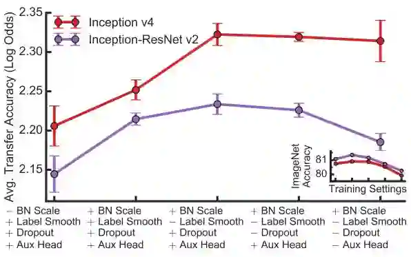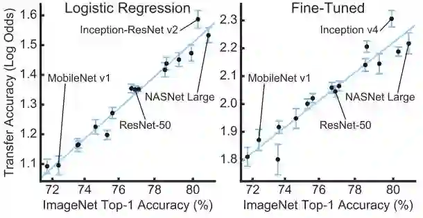 如上,左图是直接把网络倒数第二层特征直接拿出来进行迁移学习(使用Logistic Regression),右图是在新应用上find-tuned的迁移学习表现。可以注意到,只要是模型本来表现就好(横左标),迁移的效果就更好(纵坐标)。从性能最差的MobileNet到性能最好的Inception-ResNet无一例外。