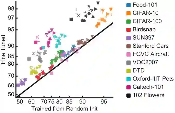 文章指出,对于find-grained分类数据集(大类中含小类,小类中还能分类),如果数据量小的话,迁移学习确实有用,而如果数据量非常大,从头开始训练和迁移学习最后的效果差别不大。如上图,每个点是模型在一个数据集上迁移学习和从头训练的准确率。