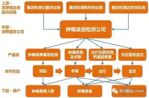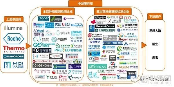 与其他的基因检测行业类似,肿瘤基因检测行业的上中下游关系明朗。上游由基因检测相关用品供应商组成,为中游的肿瘤基因检测公司提供测序仪器、测序耗材、测序试剂等产品。中游的检测公司则向下游包括肿瘤易感人群、肿瘤患者和医生在内的用户群体提供相应的基因测序服务。
