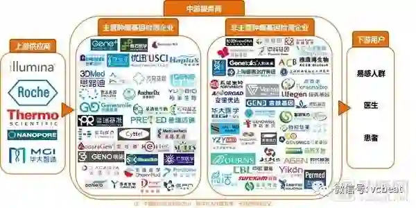 中游的测序服务公司目前同质化较为严重。多数公司缺乏旗帜鲜明的特点,都用同样的手段,提供着类似的服务。头部企业不明显使得我们很难以某种标准来对行业内的企业进行分类和归纳。因此目前我们只能以公司是否以肿瘤基因检测产品为主要业务方向,将参与到肿瘤基因检测行业的公司划归两类。