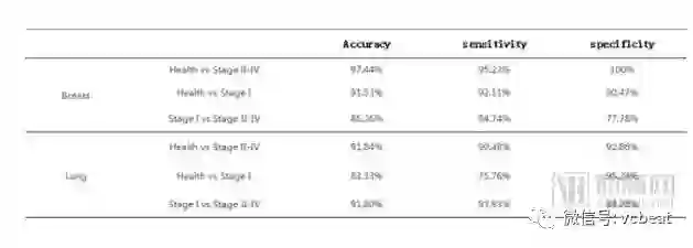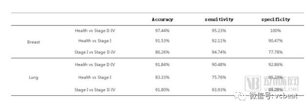 根据优迅医学的披露,肺癌研究共207例样本入组,乳腺癌研究共入组212例样本。研究结果表明,该分析方法在针对健康人群、早期患者、中晚期患者的样本比对中,在准确性、敏感性、特异性三个方面均得到了较好的印证。多数检测有效率在90%以上,最低值也超过75%。对比常规检测使用的肿瘤标志物方法,其灵敏度和特异性都有大幅提升,并且不受肿瘤原发部位的影响。