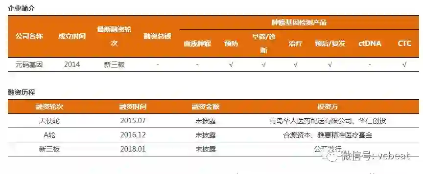 元码基因2014年在北京成立,曾在2015年和2016年进行过天使轮和A轮的融资,投资方包括华人创投、合源资本、雅惠精准医疗基金等,具体融资额未披露。2018年1月,元码基因在新三板上市。